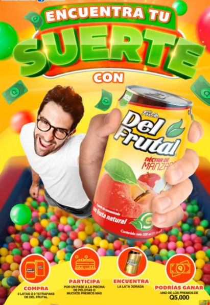 “Nuestros consumidores podrán ganar un pase a la piscina de pelotas y vivir la experiencia única de zambullirse para buscar la lata dorada, destaparla y conocer el monto del premio a ganar, el cual puede ser de Q100.00 hasta Q5,000.00, o recibir artículos promocionales y mucho producto Del Frutal”, expuso Ricardo Palma, Gerente de marca Del Frutal.