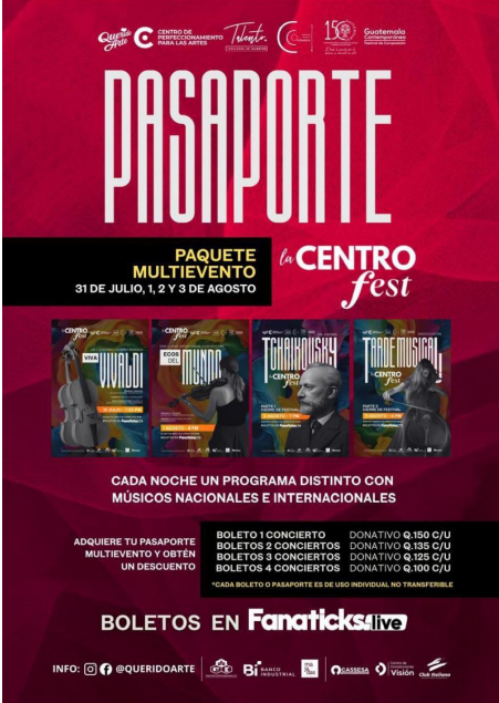 Entradas y Pasaporte Multievento Cada concierto tiene un costo de Q150, pero si querés vivir más de uno, ¡tenemos un Pasaporte Multievento con descuentos especiales para vos! • 1 concierto → Q150 • 2 conciertos → Q135 cada uno • 3 conciertos → Q125 cada uno • 4 conciertos → Q100 cada uno Entre más conciertos vivís, más ahorrás. Adquirí tus entradas o tu pasaporte en: www.fanaticks.live El arte es un lenguaje que nos une. Viví cuatro días de música en vivo, emoción y talento en el Festival Internacional LA CENTRO.