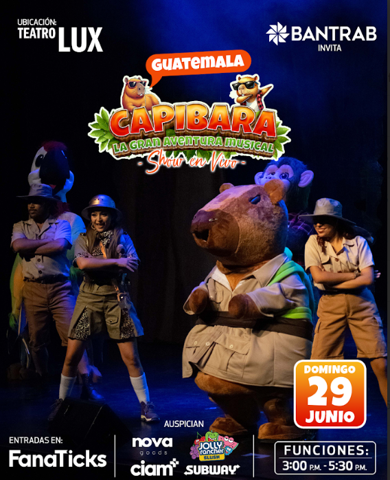 Vivo Espectáculos trae la fantasía en este show que cuenta con bailes y juegos en vivo y con más de 20 artistas en escena. Disfruta en familia del espectáculo infantil más esperado de la temporada, “Capibara, la Gran Aventura Musical” que se presentará el 7 de junio en Xela y 29 de junio en la ciudad Guatemala.