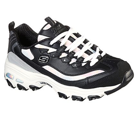 Date un capricho con el estilo brillante y colorido de la línea SKECHERS D'Lites. Parte superior de piel lisa y tejido con efecto marmolado metalizado en una zapatilla deportiva de estilo casual con cordones, costuras de adorno y capas superpuestas que darán de que hablar.