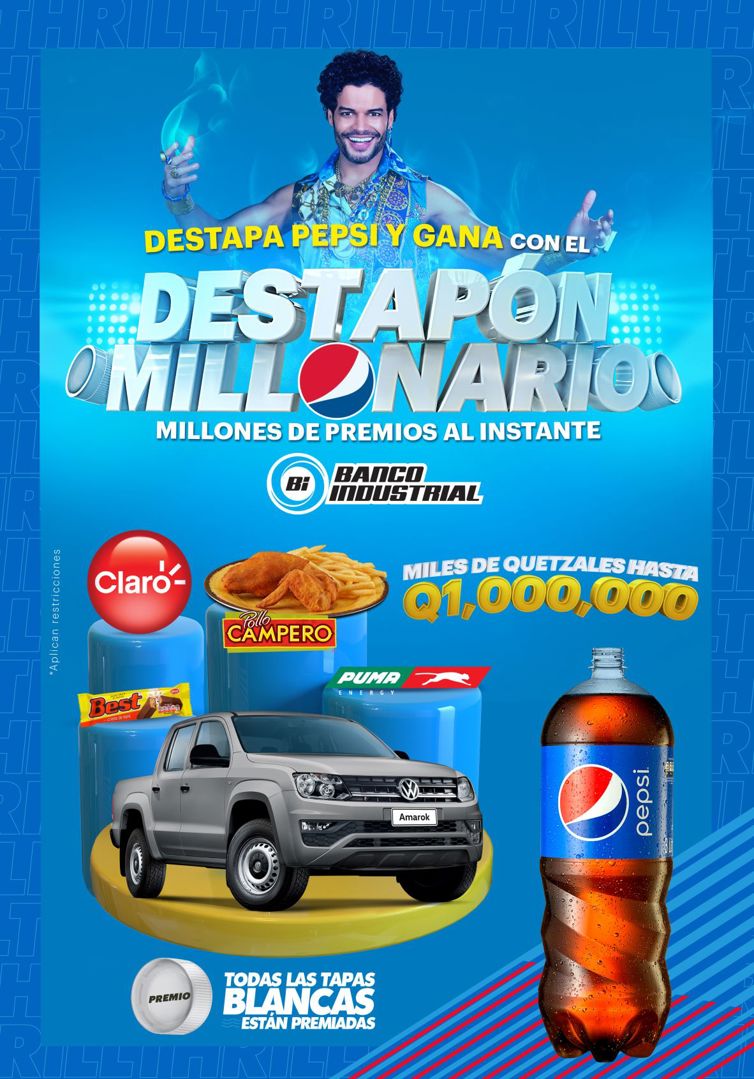 Guatemala, 30 de junio de 2021 - Cada año, además de frescura y sabor, Pepsi busca llevar alegría a los hogares de toda Guatemala a través de la promoción más grande a nivel nacional “Destapón Millonario de Pepsi”. Creando alianzas con las marcas más reconocidas del país, Pepsi sorprenderá a los consumidores con miles de premios de Claro y Pollo Campero, combustible Puma, galletas Best, vehículos Volkwagen último modelo y hasta Q1,000,000 de Banco Industrial.